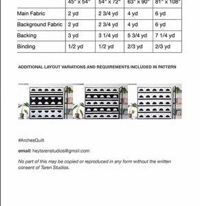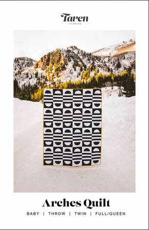 The Arches Quilt by Allie Perry of Taren Studios features pieced curves and stripes. Finished size is 54″ x 72″.