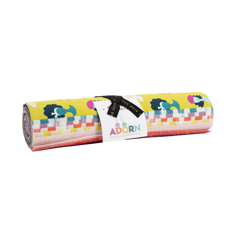Adorn layer cake includes 42 10″ x 10″ squares of fabric. Adorn is the latest fabulous collection by Rashida Coleman Hale for Ruby Star Society. Primping in the mirror, picking out jewellery, decorating with fresh flowers – Adorn celebrates those little rituals that make us feel good about ourselves. You’ll see fabulous ladies, earrings with metallic findings, flowers and bows all in a bright and punch palette that’s sure to lift your spirits.