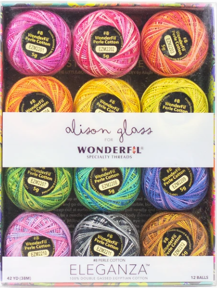 The Alison Glass Collection of Eleganza by Wonderfil is a gorgeous 8wt, 2-ply 100% long staple Egyptian cotton thread that is double-gassed and mercerised. Resulting in a wonderfully smooth and lustrous surface that allows the thread to glide beautifully through all types of fabrics and fibres. The thread’s tight twist creates beautifully firm stitches while its surface sheen produces a luxurious finish to embellishment stitchery. Offered in 48 different colours ranging from saturated solids to contrasting variegates (colour changes every 2”), Eleganza is a perfect match for your next hand work or embellishment project.