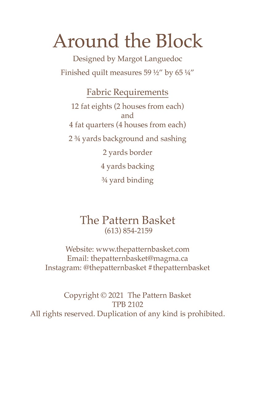 Around the Block quilt pattern finishes 59.5in by 65.25in.