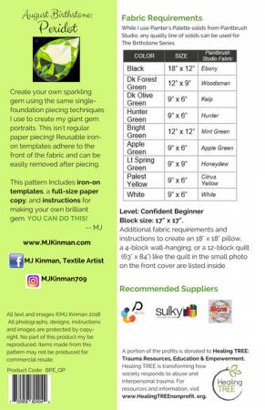 Freezer paper piecing Block pattern for 17 in. square block representing the August birthstone Peridot. Includes a fully-coded freezer paper template; full-scale paper copy to use as a key; and 12-page pattern booklet that includes fabric requirements (including recommendations from Paintbrush Studio’s Painter’s Palette solids), detailed instructions for block construction, and instructions and fabric requirements for optional projects (i.e., 18 in square pillow, 4-block wall-hanging, 12-block full-size quilt as shown on pattern cover), and quilting suggestions. Single-foundation piecing is not typical paper piecing: templates are ironed to the RIGHT side, so there is no confusing reverse piecing; templates are easily removed and REUSABLE, so there are no paper bits to pull from the back of the quilt; reduces fabric waste since there is no flip-and-sew method used. Makes wonderful Block of the Month project, Mother’s Day quilt (featuring the family’s birthstones), baby quilt (featuring Baby’s birthstone), or Guild group challenge project. A video of MJ demonstrating the techniques will be available soon.