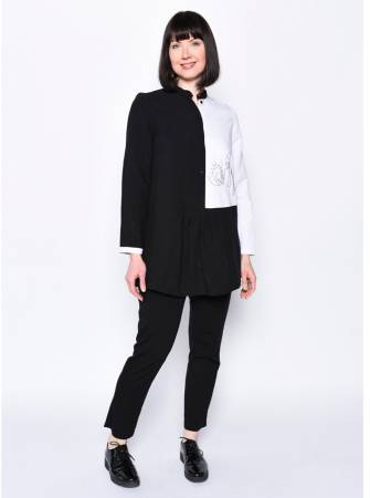 Semi-fitted tunic with front concealed placket, front peplum skirt with soft pleats, side vents, band collar, and long sleeves with bound placket and narrow, lapped bands.