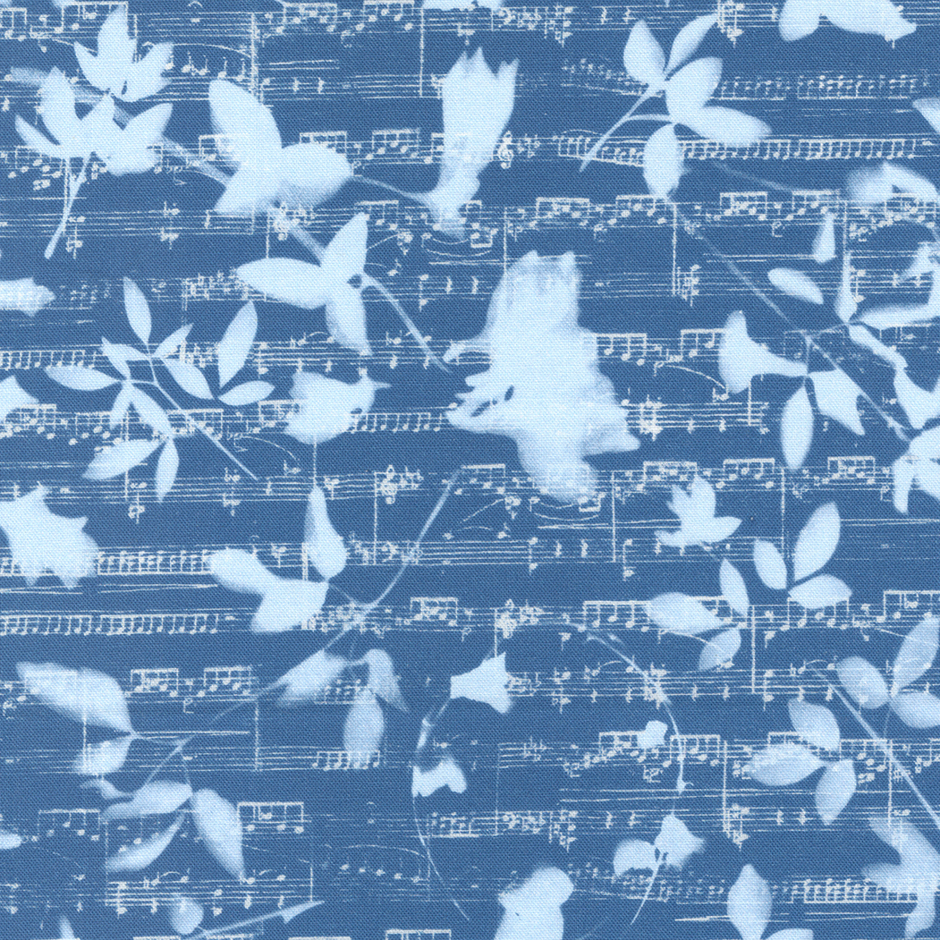 start to develop right before your eyes. It’s a beguiling process. Bluebell features my floral cyanotypes in every shade of blue with gentle greens layered with a subtle lace texture, a musical score and a flowing vintage calligraphy script. Bluebell and the quilts I make with it will forever remind me of those warm days playing in my garden with the sunshine and flowers.” – Janet Clare