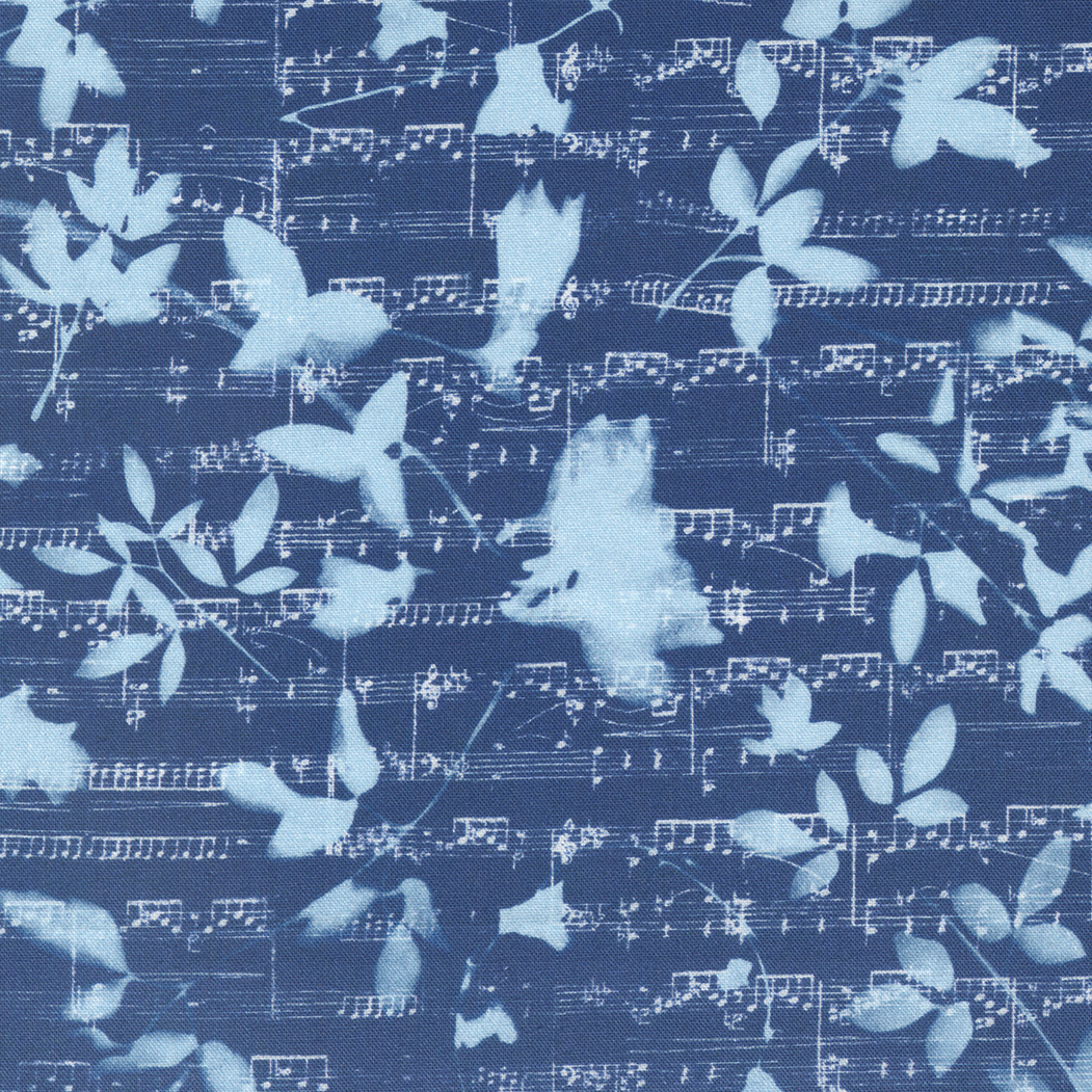 start to develop right before your eyes. It’s a beguiling process. Bluebell features my floral cyanotypes in every shade of blue with gentle greens layered with a subtle lace texture, a musical score and a flowing vintage calligraphy script. Bluebell and the quilts I make with it will forever remind me of those warm days playing in my garden with the sunshine and flowers.” – Janet Clare