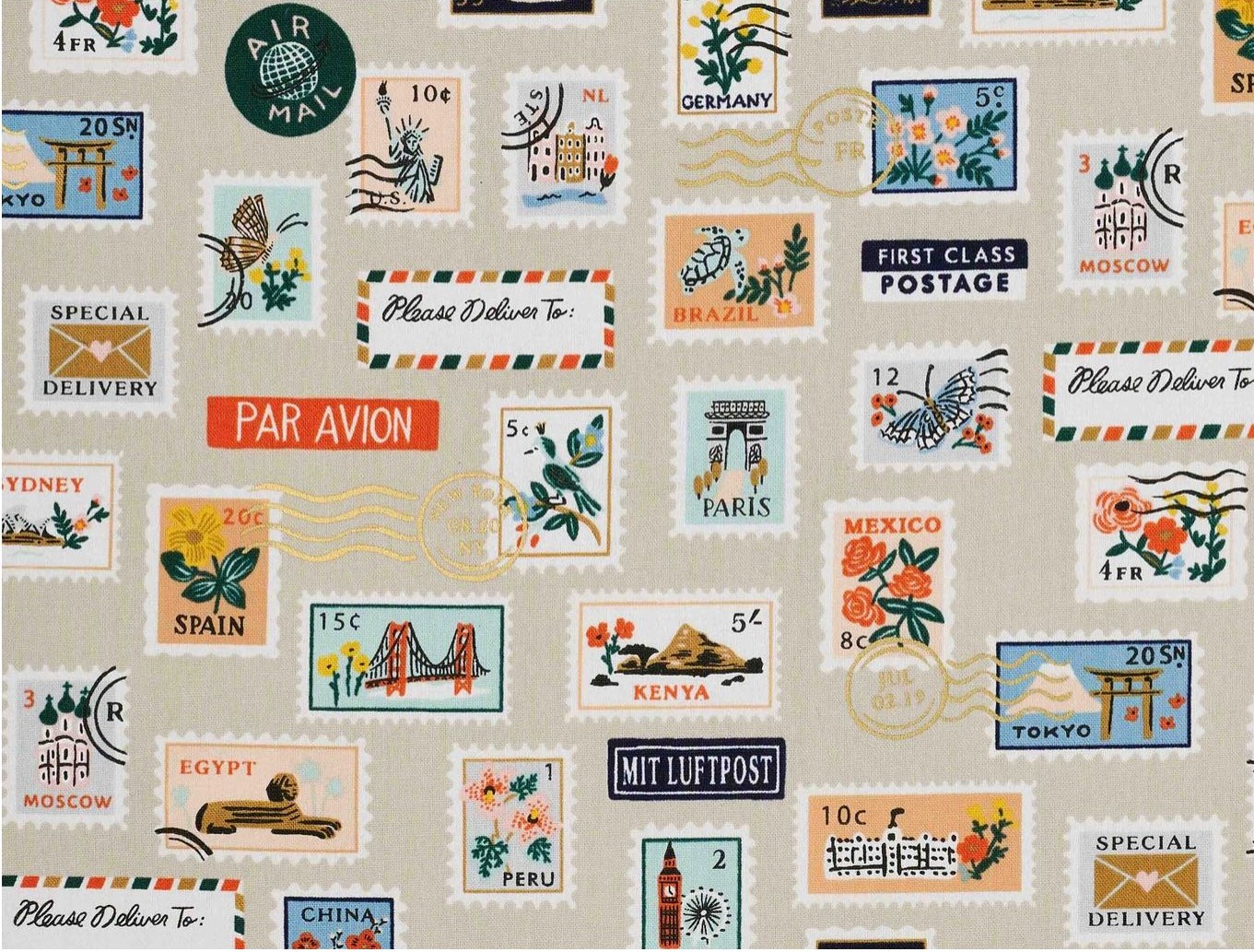 Bon Voyage fabric collection designed by Rifle Paper Co. for Cotton + Steel is a goodbye to home and hello to world travel. Get those postage stamps from around the world while taking in the sights from Los Angeles to Tokyo with a stop in Venice or Paris for the day. Explore Rio de Janeiro, Istanbul and beyond! Bon Voyage and enjoy much needed travel. Don’t stop and smell the flowers, go and see the flowers!