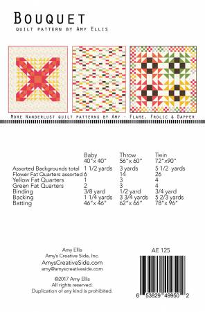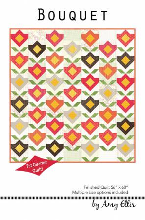 Bouquet is a cute and fun quilt to make! Pull out your favorite fat quarters and get started – today. These flower blocks are easy to make one at a time and watch your bouquet grow as you sew. Finished size: 56in x 60in.