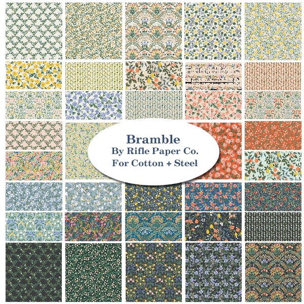 Bramble fabric collection designed by Rifle Paper Co. for Cotton + Steel. Inspired by lush gardens and vintage textiles with organic, abstract prints that incorporate iconic Rifle Paper Co. floral elements. This cotton is a versatile material ideal for creating garments, accessories, quilts, and other home décor items.
