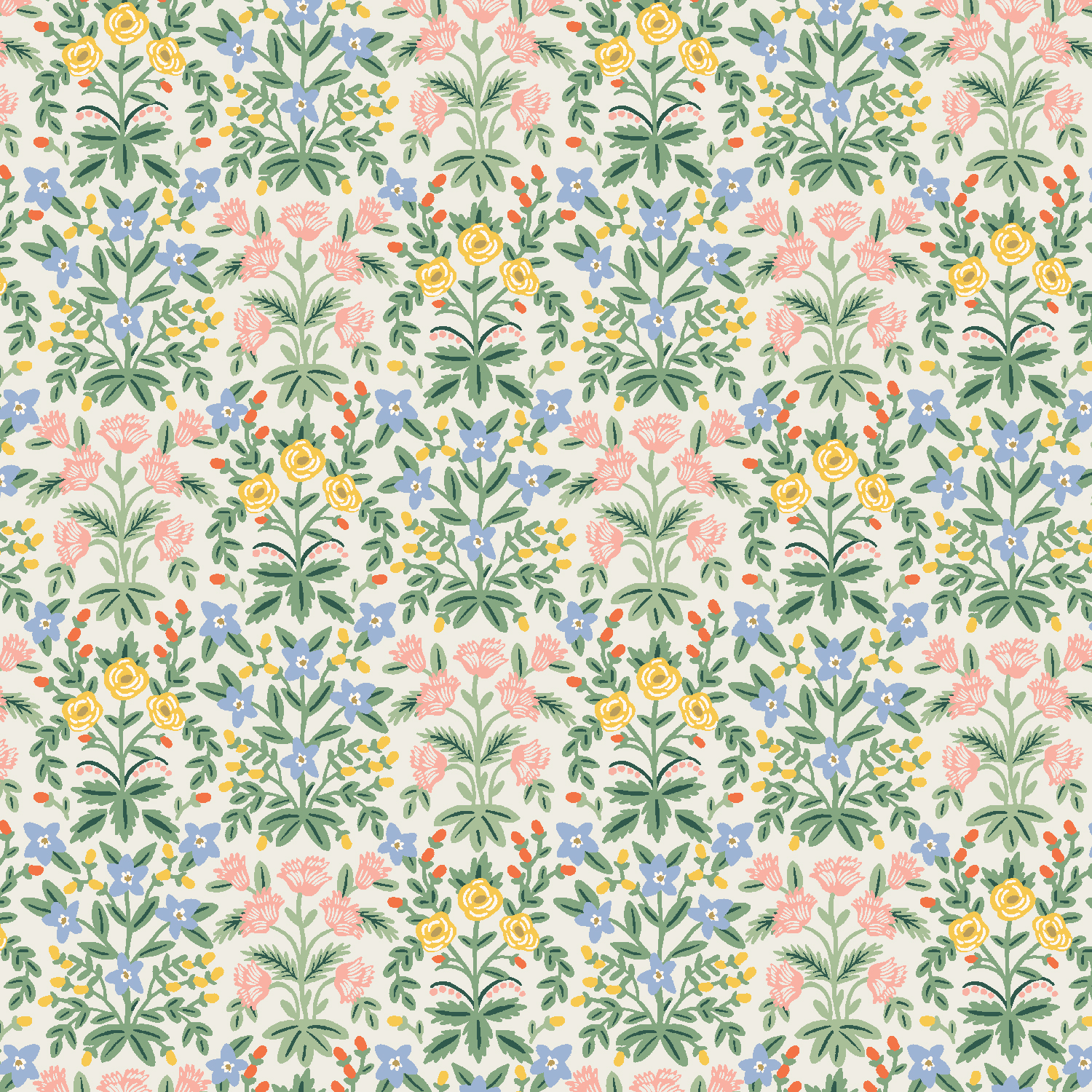 Bramble fabric collection designed by Rifle Paper Co. for Cotton + Steel. Inspired by lush gardens and vintage textiles with organic, abstract prints that incorporate iconic Rifle Paper Co. floral elements. This cotton is a versatile material ideal for creating garments, accessories, quilts, and other home décor items.