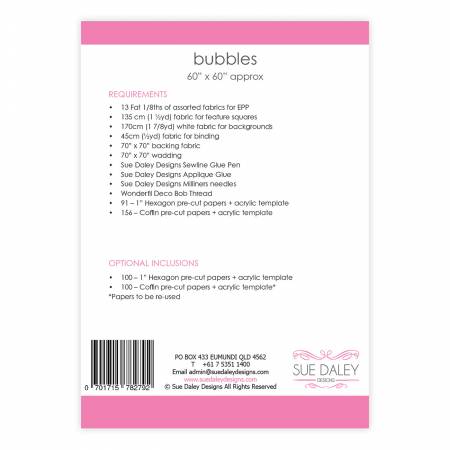 This beautiful quilt design uses a trio of techniques including English Paper Piecing, Applique and machine piecing. Using the pre-cut paper shapes provided you will create this 5 block x 5 block quilt top perfect for any bed top. The original fabrics used in this quilt are Celebrate by Sue Daley for Riley Blake Designs.