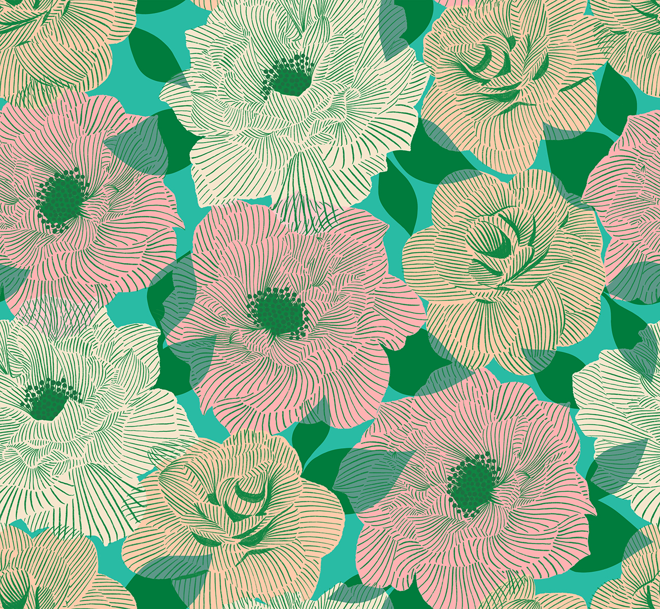 Camellia by Melody Miller for Ruby Star Society. Melody was inspired by the idea of a 1960’s tea room layered in an assortment of prints and patterns from wallpaper, upholstery, flowering plants and china dishes.