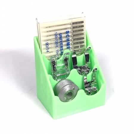 Keep your most used notions close by with Cat’s Cradle. Cheryl from The Yankee Quilter asked me to design a product that could keep her snap-on feet organized while she worked on a project that required switching between several different presser feet. Together we created Cat’s Cradle to hold your most used notions: snap-on presser feet, needles and Class-15 bobbins. Cat’s Cradle has three slots that can hold up to 6 snap-on presser feet, or store up to two packs of needle per slot, or two Class-15 bobbins per slot. We included an adhesive patch to adhere Cat’s Cradle to your sewing machine (the adhesive is removable and leaves no residue) but it’s also short enough that you can store it under your Sew Steady table so it’s within reach but out of the way. Package includes one Cat’s Cradle and one adhesive patch.
