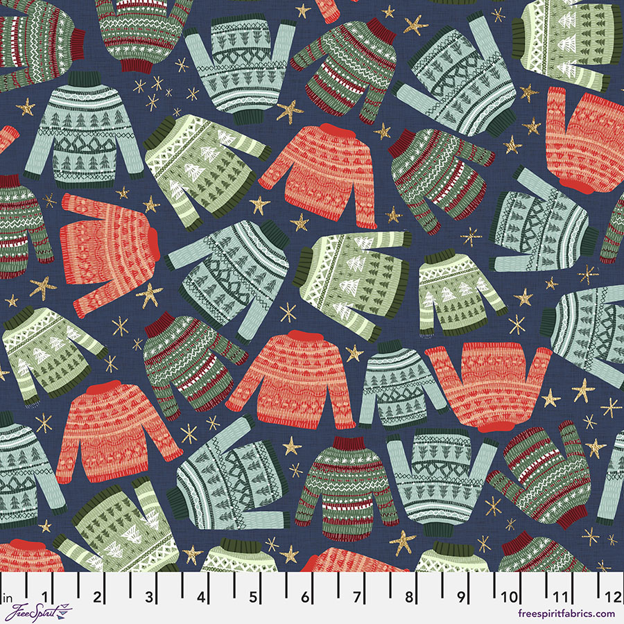 Christmas Squad, designed by Mia Charro for FreeSpirit Fabrics, features mittens, fuzzy friends, and winter clothes.