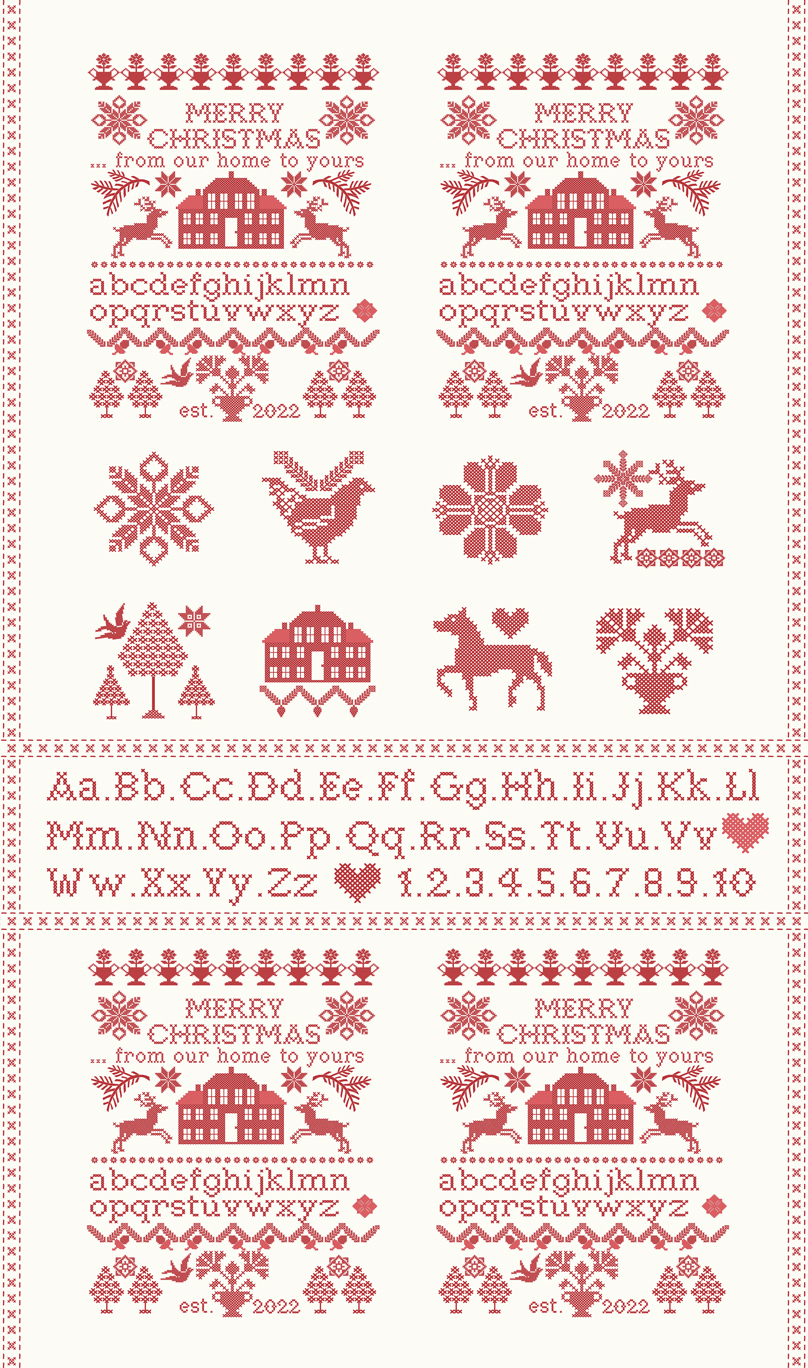 Christmas Stitched by Fig Tree & Co for Moda Fabrics. Inspiration for this collection came from vintage stitcheries and the idea of capturing all your Christmas memories to create heirlooms. With a colour palette of soft reds, greens and tans mixed with pinecone, holly and gingham prints. This collection is perfect for the Christmas season!