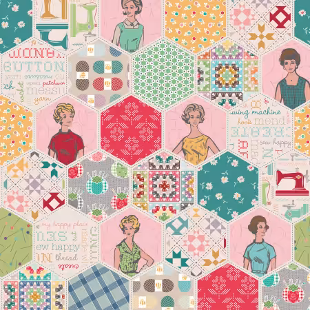This vibrant fabric features a delightful patchwork of hexagonal designs, each showcasing retro-inspired illustrations of women in vintage sewing attire, surrounded by sewing notions like spools of thread, sewing machines, and patchwork quilts. The design is playful and nostalgic, with a colour palette that includes shades of green, pink, yellow, and blue, creating a cheerful and creative atmosphere perfect for sewing projects that celebrate the joy of crafting.