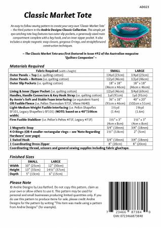 An easy to follow sewing pattern to create a classically styled market tote in just a few simple steps! This pattern has been designed to be practical yet still have that wow factor. It features two outer slip pockets, a generously sized main compartment complete with a key hook, and an inner zipper pocket. It also includes a simple magnetic snap closure, gorgeous O-rings, and straightforward construction techniques. It is the third pattern in the Andrie Designs Classic Collection. 2 sizes included in pattern; includes 12-page booklet, pattern pieces and labels for the pattern pieces.