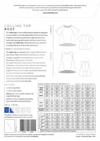 The Collins top is a loose-fitting trapeze-shaped top designed for woven fabrics. It is the perfect piece for hot summer days. It features a round neck, panel lines and a high-low hem. Due to its length, the Collins top is the perfect top to pair with skirts or trousers that sit on or above the natural waist.