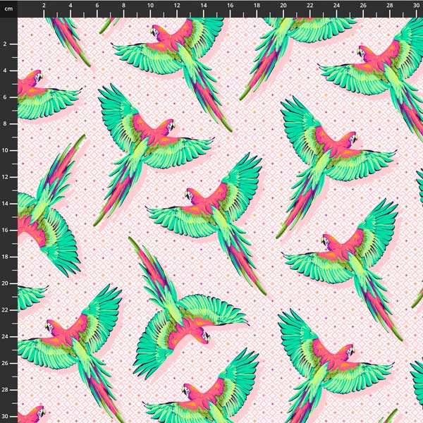 ‘When I designed Daydreamer I was five months into the Shelter in Place order in my state. I was stuck at home in the Midwest during the rainiest summer in recent memory. I did what I do best and imagined myself in another place, in another world, and I drew everything that I saw while I was there. I spent a lot of time there, it was lovely. Day-dreamer is an escape to a surreal place of make believe and wonder. Everything here is light and happy. When I first landed, I met a pair of striped legged Flamingos nibbling on the very shrimp that give them their radiant pink colour. Overhead I witnessed a flock of vividly coloured Macaws in all of their vibrant plumage soaring through an Ombre coloured sunset. An array of omniscient butterflies landed on my shoulders and fluttered their soft wings against my cheeks as a sweet welcoming hello. In the tall grass behind me lurked a family of rainbow Jaguars that sparkled like constellations under a full moon. A panorama of tiny rainbows lit up the sky and reminded me of the magic that happens when the sun meets the rain. The sweet nectar of tropical fruits bloomed all around me filling the air with fresh sugary delight. Day-dreamer is like a soft warm blanket that I can wrap my mind in when it’s cold and rainy outside. I am a Daydreamer and I think you might be a Daydreamer too.’ – Tula Pink.