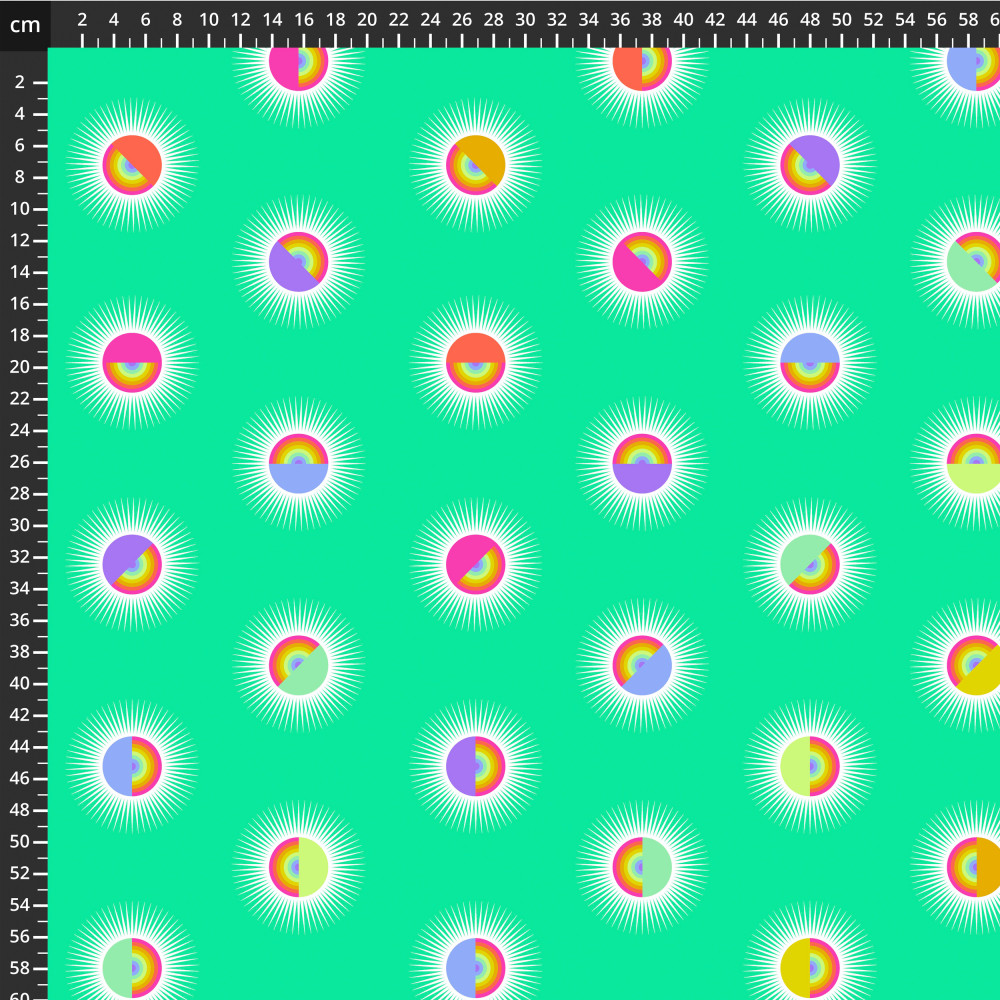 ‘When I designed Daydreamer I was five months into the Shelter in Place order in my state. I was stuck at home in the Midwest during the rainiest summer in recent memory. I did what I do best and imagined myself in another place, in another world, and I drew everything that I saw while I was there. I spent a lot of time there, it was lovely. Day-dreamer is an escape to a surreal place of make believe and wonder. Everything here is light and happy. When I first landed, I met a pair of striped legged Flamingos nibbling on the very shrimp that give them their radiant pink colour. Overhead I witnessed a flock of vividly coloured Macaws in all of their vibrant plumage soaring through an Ombre coloured sunset. An array of omniscient butterflies landed on my shoulders and fluttered their soft wings against my cheeks as a sweet welcoming hello. In the tall grass behind me lurked a family of rainbow Jaguars that sparkled like constellations under a full moon. A panorama of tiny rainbows lit up the sky and reminded me of the magic that hap-pens when the sun meets the rain. The sweet nectar of tropical fruits bloomed all around me filling the air with fresh sugary delight. Day-dreamer is like a soft warm blanket that I can wrap my mind in when it’s cold and rainy outside. I am a Daydreamer and I think you might be a Daydreamer too.’ – Tula Pink.
