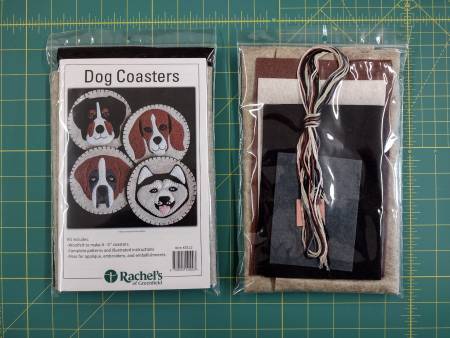 Attention all dog lovers. The dog coasters complete kit makes a set of 4 coasters. The kit includes the pattern and templates as well as all woolfelt and floss required to make the coasters. Each coaster is approximately 5” in diameter. Colors are Sandstone, black, rust, charcoal, and white. These adorable coasters will add charm to your collection. They can also be used as ornaments.