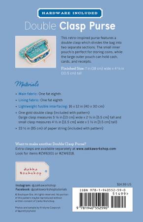 This retro-inspired purse features a double clasp which divides the bag into two separate sections. The smaller inner pouch is perfect for storing coins, while the larger outer pouch can hold cash, cards, and receipts. Finished Size: 7″ (18 cm) wide x 4 ” (10.5 cm) tall. Kit includes: pattern, rose gold metal purse clasp, and paper string for installation. Extra clasps are also available separately.