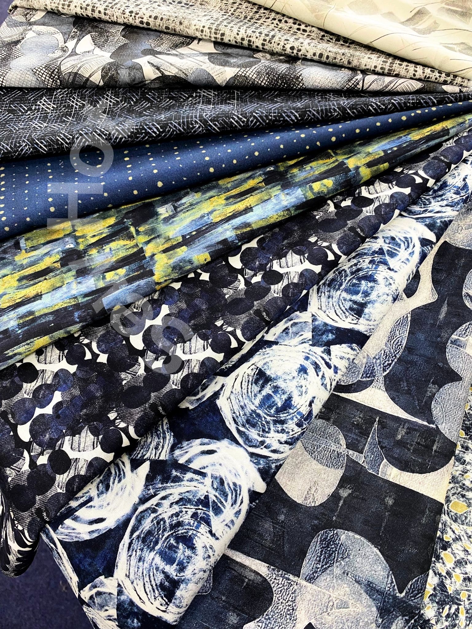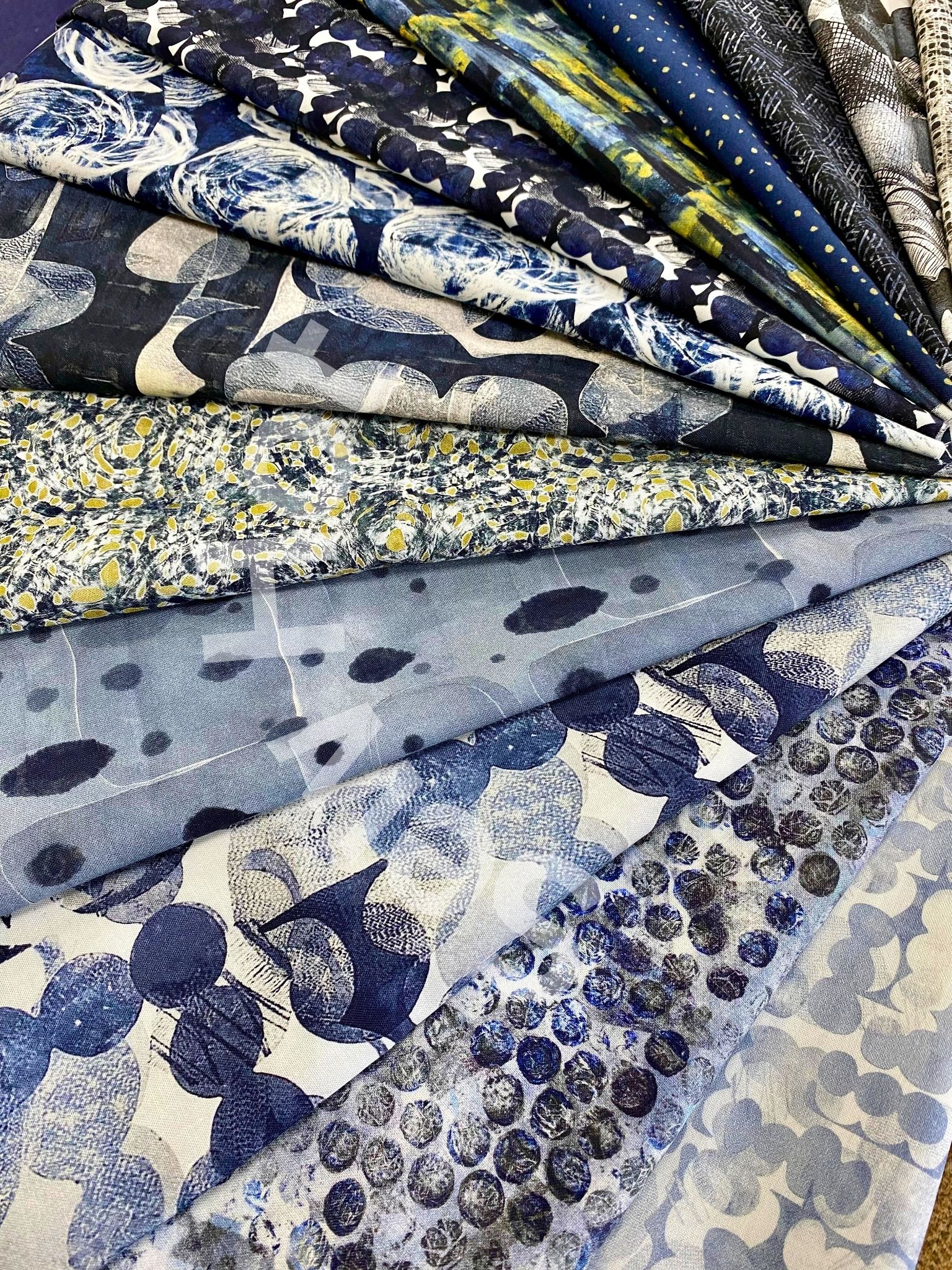 ‘My fourth collection for FreeSpirit Fabrics is called Eclipse. This collection was inspired by a combination of events that were happening in my life during 2024. On April 8th, The Great North American Eclipse occurred, inspiring me in many ways. I viewed the Eclipse in New York City at Madison Square Park; the park was filled with thousands of people leaving their busy workday to come together and view this natural wonder. In a city that can often make you feel anonymous, sharing this amazing experience with so many people was heartwarming and created a sense of mutual togetherness. At this time, I was also expecting my first child and was going through an eclipse of changes in both my physical body and life. I was evolving to become a mother and moving out of NYC after calling it home for fourteen years. With so many changes in my life, it was both a terrifying and exciting time. My art has always been an extension of my emotions, and the pieces I create help me work through them. The Eclipse collection captures these emotions with a sense of movement, roundness, boldness, togetherness, layers of light and dark, and intertwined, directional prints. The fourteen designs are made from my original monotypes. Monotypes are a one-of-a-kind printmaking practice created by painting directly onto a plate and running the plate through a printing press. In my monotypes for Eclipse, I utilized unique and unexpected textures of both natural and man-made objects such as vegetable wrappers, bubble wrap, netting, or discarded plastic packaging in my work. I enjoy this printmaking process because it involves a sense of spontaneity and it always includes an element of surprise. I look forward to seeing how you use the Eclipse collection in your next projects.’ Sarah Sczepanski