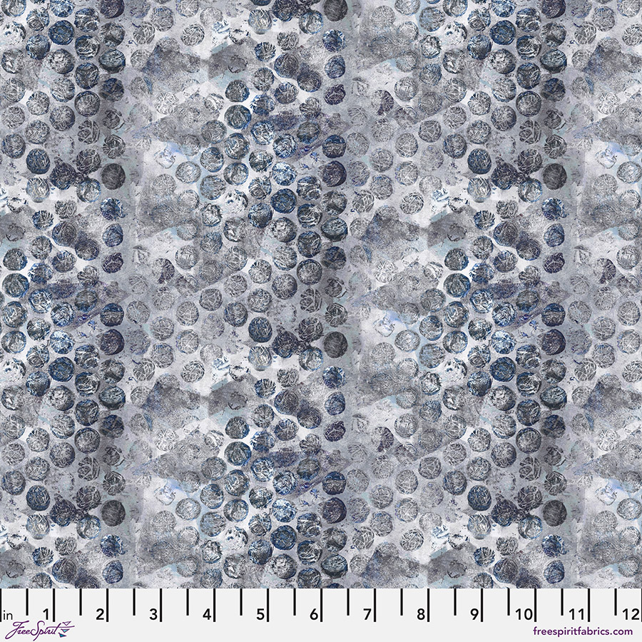 ‘My fourth collection for FreeSpirit Fabrics is called Eclipse. This collection was inspired by a combination of events that were happening in my life during 2024. On April 8th, The Great North American Eclipse occurred, inspiring me in many ways. I viewed the Eclipse in New York City at Madison Square Park; the park was filled with thousands of people leaving their busy workday to come together and view this natural wonder. In a city that can often make you feel anonymous, sharing this amazing experience with so many people was heartwarming and created a sense of mutual togetherness. At this time, I was also expecting my first child and was going through an eclipse of changes in both my physical body and life. I was evolving to become a mother and moving out of NYC after calling it home for fourteen years. With so many changes in my life, it was both a terrifying and exciting time. My art has always been an extension of my emotions, and the pieces I create help me work through them. The Eclipse collection captures these emotions with a sense of movement, roundness, boldness, togetherness, layers of light and dark, and intertwined, directional prints. The fourteen designs are made from my original monotypes. Monotypes are a one-of-a-kind printmaking practice created by painting directly onto a plate and running the plate through a printing press. In my monotypes for Eclipse, I utilized unique and unexpected textures of both natural and man-made objects such as vegetable wrappers, bubble wrap, netting, or discarded plastic packaging in my work. I enjoy this printmaking process because it involves a sense of spontaneity and it always includes an element of surprise. I look forward to seeing how you use the Eclipse collection in your next projects.’ Sarah Sczepanski