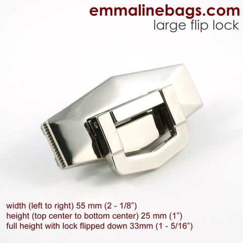 The Large Flip Lock is a heavy, high quality, super shiny, nickel finish, flip lock that is perfect for your purse, satchel, or clutch. I just love the shine and eye-catching bling they give to a handmade bag. They would suit well on a flap or wide strip over your bag opening, giving it a super professional look.