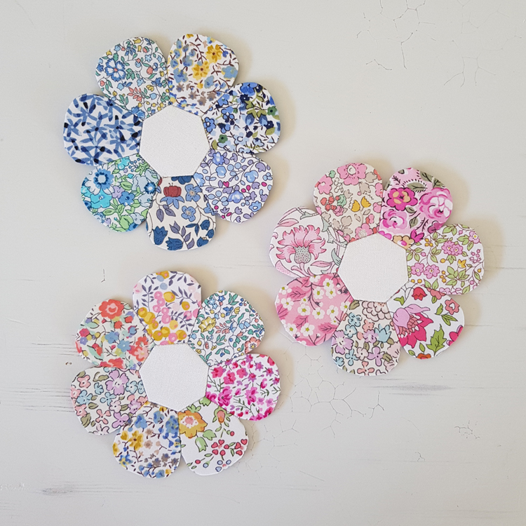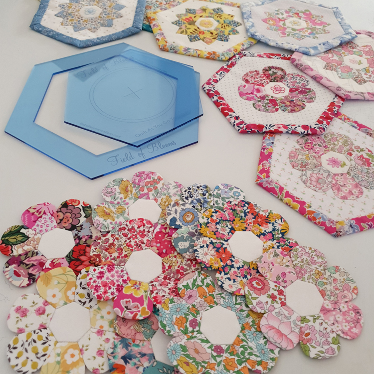 “Field of Blooms” is a fun, relaxing project that plays with English Paper Piecing and Appliqué. ‘Field of Blooms’ is a project card and template set that is designed to work with the Mini Blossom, Mini Tenderness and Mini Indulgence Templates and Papers (available separately) thus allowing the maker to choose one bloom type for their field (Mini Blossom is pictured), two blooms for variety or all three for a field of ‘cottage inspired wildflowers’. Each block is finished using the Quilt As You Go method and the block finishes at approx 6.5” at the widest point.