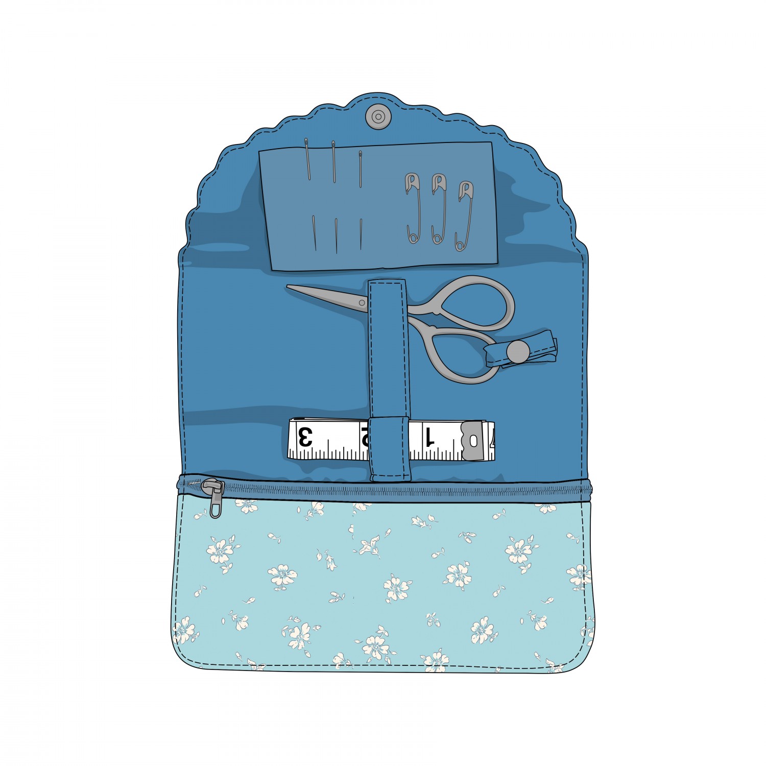 Liberty Fabrics Notions Collection adds charm to your sewing kit! The Liberty Fabrics Sewing Roll allows you to carry your most trusted sewing tools with you anywhere you go. The sewing pouch includes 1 embroidery scissors, 1 tape measure, 3 safety pins, and 3 needles. It also has a zip pocket for other items.