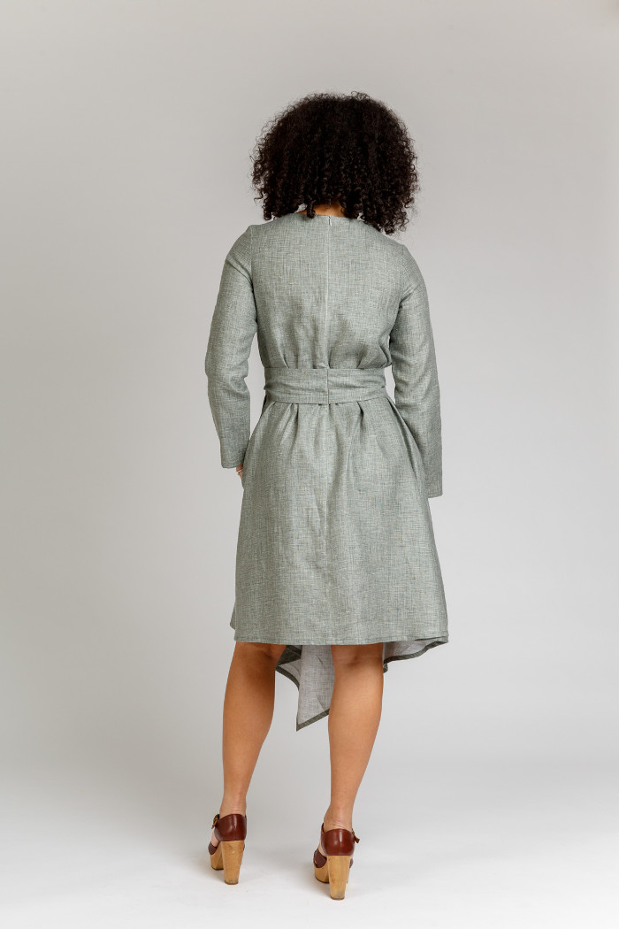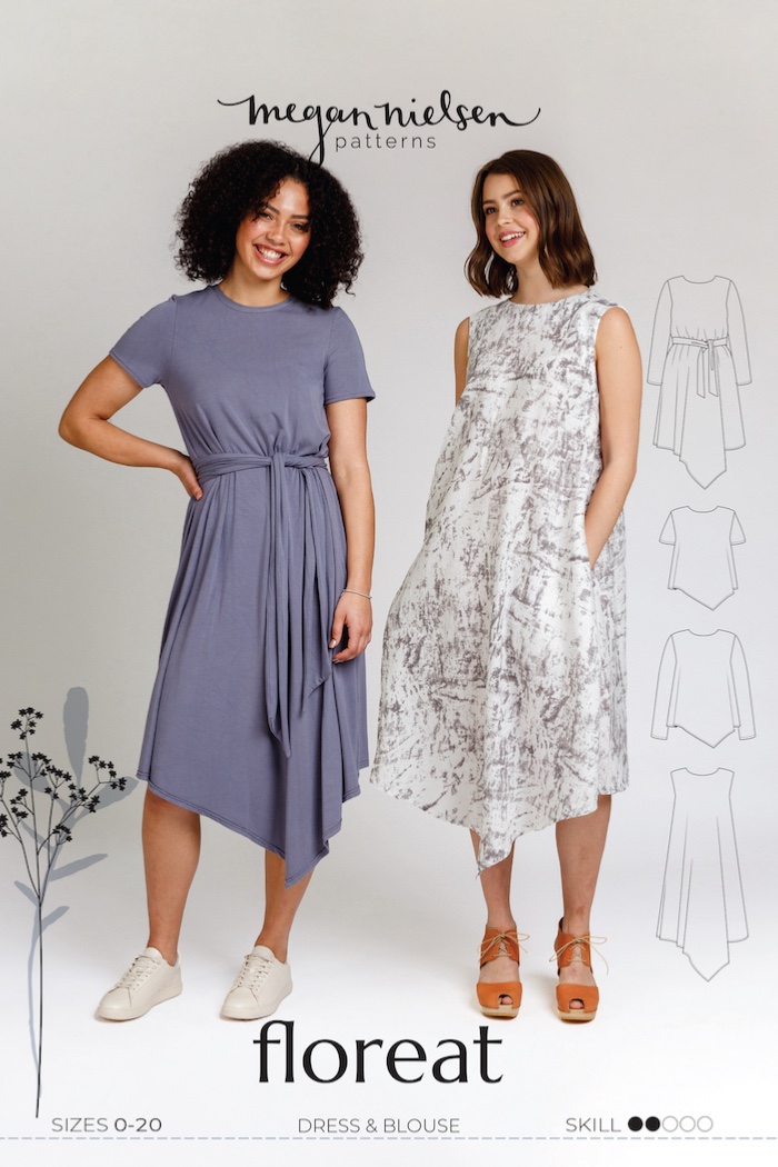 Floreat is an asymmetrical dress or blouse that can be made from woven or knit fabrics. The pattern features clean lines, woven and knit facing options, inseam pockets as well as multiple sleeve and hem lengths.View A is a dress with long sleeves and waist ties. View B is a blouse with long sleeves. View C is a cropped blouse with short sleeves. View D is a sleeveless dress or blouse.