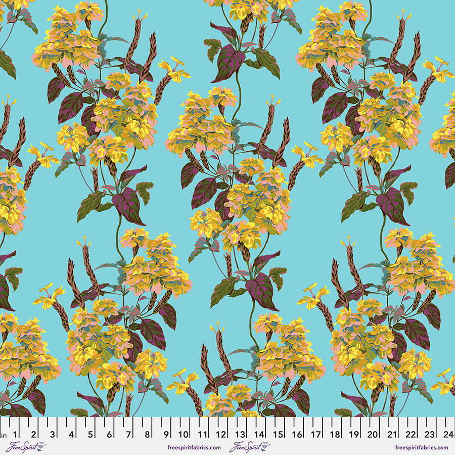 Anna Maria Horner is known for her beautiful drawings of flowers and foliage, she also enjoys playing with colour and texture. Her collection Fluent, for Free Spirit Fabrics, is a love letter to all things floral. The collection takes us on a tour of colour saturation and includes pale creams, bright blues, deep aubergine, cerise, lilac and a deep navy blue. Anna says “The Raiment floral print was my first drawing and is based on a beautiful flower that I bought from a local nursery. Before I knew its name, I thought the blooms looked like tiered and ruffled skirts. I later learned it is indigenous to Sri Lanka and its name means “clothing”. It was a moment of the flower speaking to me first, and I was so pleased. Other prints echo visual stories and traditional crafts from other parts of the world like Grecian Urns, hand drawn paisleys, structural lace, and imaginative florals. The scale and colour variation is ripe for exciting quilts and striking garments or home decor!”