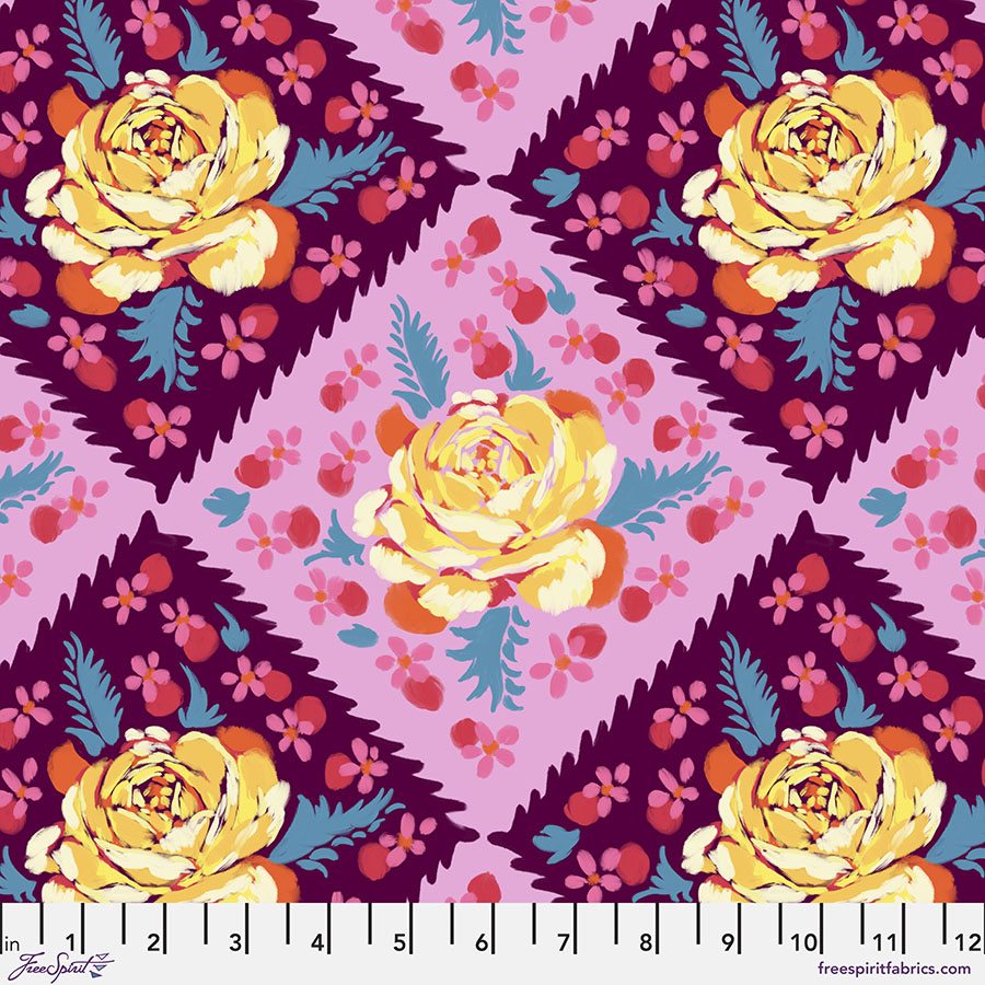 Anna Maria Horner is known for her beautiful drawings of flowers and foliage, she also enjoys playing with colour and texture. Her collection Fluent, for Free Spirit Fabrics, is a love letter to all things floral. The collection takes us on a tour of colour saturation and includes pale creams, bright blues, deep aubergine, cerise, lilac and a deep navy blue. Anna says “The Raiment floral print was my first drawing and is based on a beautiful flower that I bought from a local nursery. Before I knew its name, I thought the blooms looked like tiered and ruffled skirts. I later learned it is indigenous to Sri Lanka and its name means “clothing”. It was a moment of the flower speaking to me first, and I was so pleased. Other prints echo visual stories and traditional crafts from other parts of the world like Grecian Urns, hand drawn paisleys, structural lace, and imaginative florals. The scale and colour variation is ripe for exciting quilts and striking garments or home decor!”