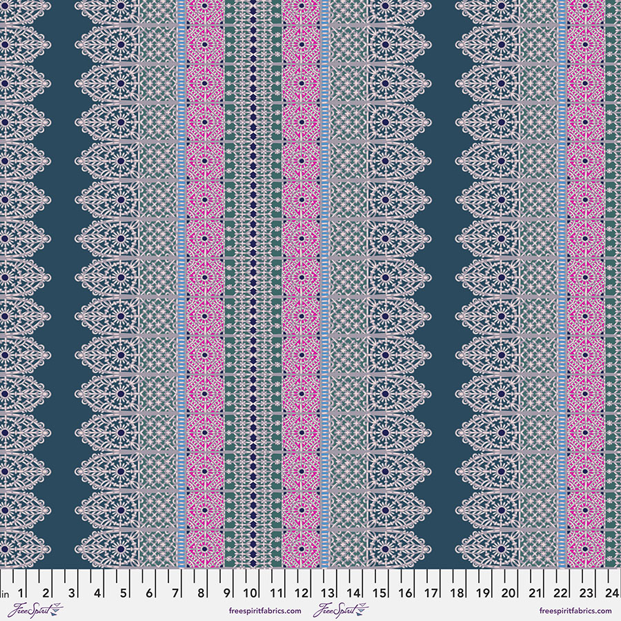 Anna Maria Horner is known for her beautiful drawings of flowers and foliage, she also enjoys playing with colour and texture. Her collection Fluent, for Free Spirit Fabrics, is a love letter to all things floral. The collection takes us on a tour of colour saturation and includes pale creams, bright blues, deep aubergine, cerise, lilac and a deep navy blue. Anna says “The Raiment floral print was my first drawing and is based on a beautiful flower that I bought from a local nursery. Before I knew its name, I thought the blooms looked like tiered and ruffled skirts. I later learned it is indigenous to Sri Lanka and its name means “clothing”. It was a moment of the flower speaking to me first, and I was so pleased. Other prints echo visual stories and traditional crafts from other parts of the world like Grecian Urns, hand drawn paisleys, structural lace, and imaginative florals. The scale and colour variation is ripe for exciting quilts and striking garments or home decor!”