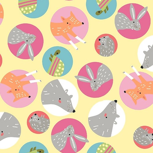 Friendship Forest by Katie Yost for 3 Wishes fabric. Filled with sweet woodland animals, rainbows and floral blooms set against a backdrop of pinks, yellows and light aqua.