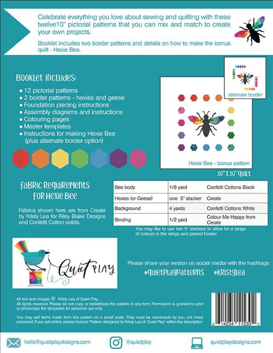 The Geometric Rainbow Quilt Booklet by Kristy Lea of Quiet Play includes foundation piecing instructions for 12 pictorial patterns and 2 border patterns (hexies and flying geese).