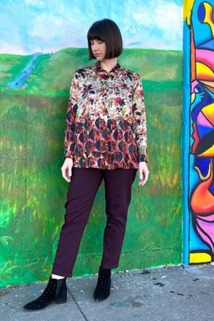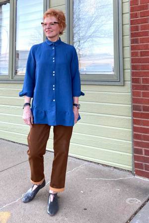 Slim tapered jeans with fly front zipper, front pockets and diagonal darts below zipper. Sits at natural waist with back yoke and elastic waist back. Ankle length with doublefold cuff detail. Optional seam finish details at fly front and hem.