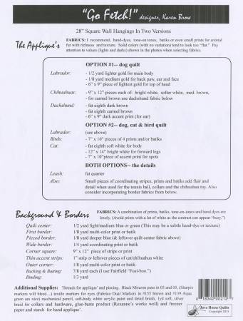 Quilted pet wall hanging in two versions: dogs, or the cat-dog-bird combination. Pieced and appliqued. Suitable for hand or fusible methods.