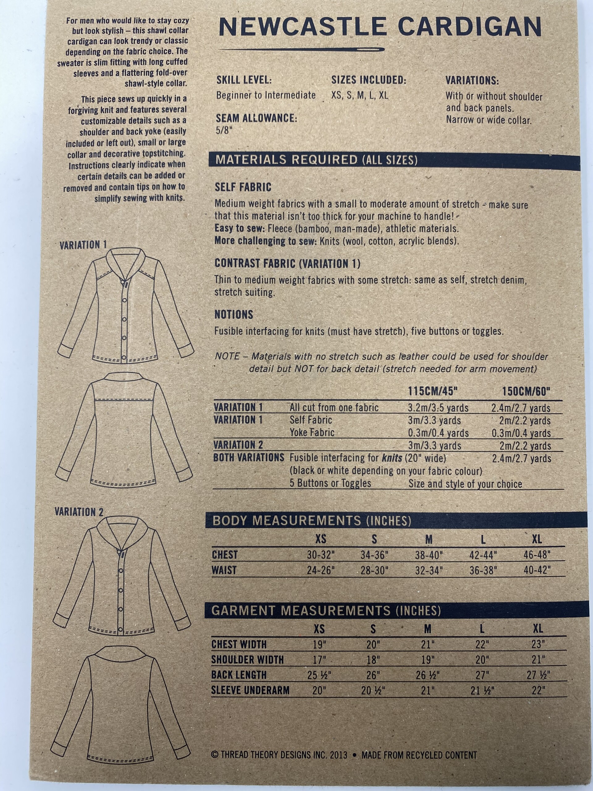 The Men’s Newcastle Cardigan sewing pattern from Thread Theory. For men who would like to stay cosy but look stylish – this cardigan can look trendy or classic depending on the fabric choice. The sweater is slim fitting with long cuffed sleeves and a fold-over shawl style collar.