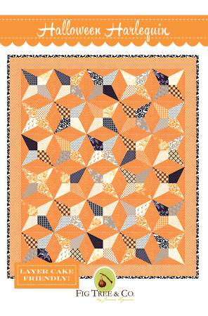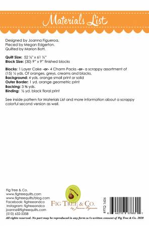 Joanna Figueroa of Fig Tree Quilts says, “Inspired by a beautiful vintage quilt that we found in the Moda Quilt Market booth many years ago, our version uses a classic Halloween colour combination this time around for a completely different feel. Our version eliminates the templates and crazy piecing that one would have to do the traditional way. I do admit, there is a bit of fabric waste . . . but we enjoy the process and the outcome so much more this way!” Size: 52 1/2″ x 61 1/2″