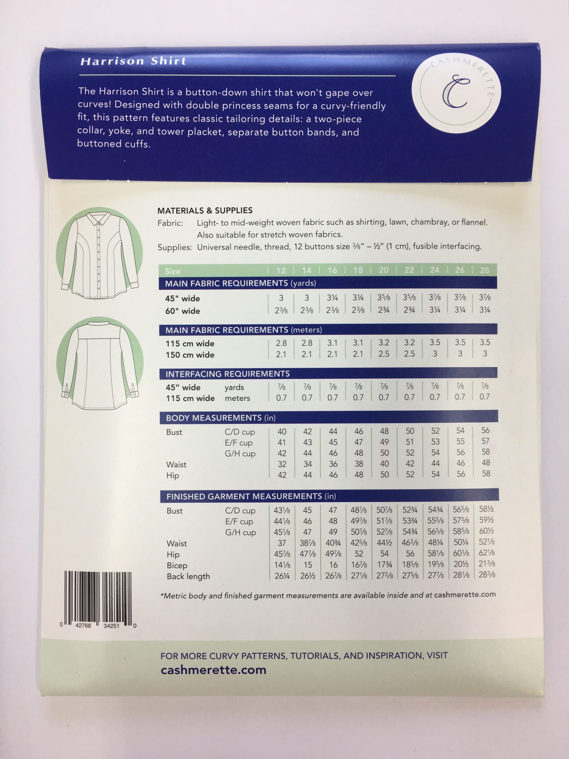 Finally, the answer to your prayers: a fitted button-down shirt that doesn’t gape over curves! The Harrison Shirt is designed with double princess seams for a uniquely curve-friendly fit and all the features of a classic shirt, including a two-piece collar, yoke, and placket, separate button bands, and buttoned cuffs. This pattern looks equally pretty in crisp Oxford cottons at the office or cozy flannels for playing in the snow!