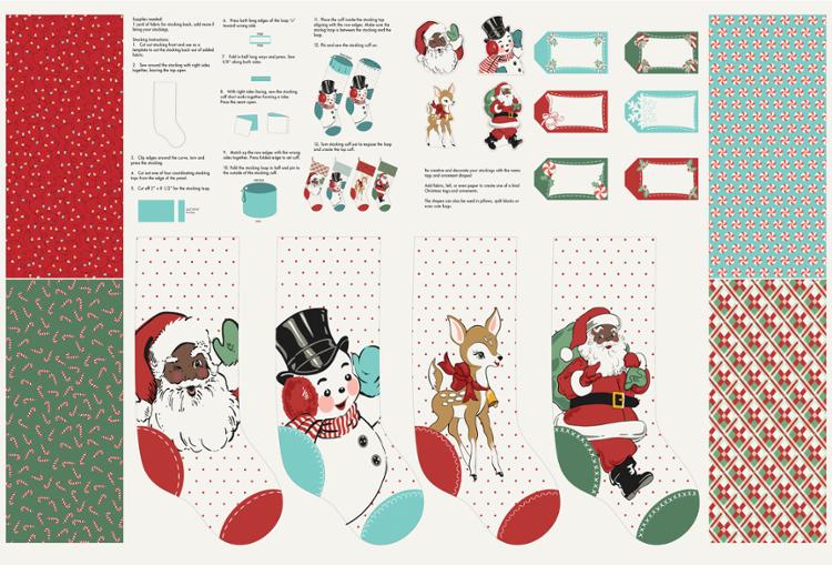 Holly Jolly by Urban Chiks for Moda. This digitally-printed panel features pieces and instructions to make 4 Christmas stockings when adding your own backing. The panel also includes Christmas shapes that can be used as ornaments and tags when backed with felt, or even used on pillows, quilts and bags!