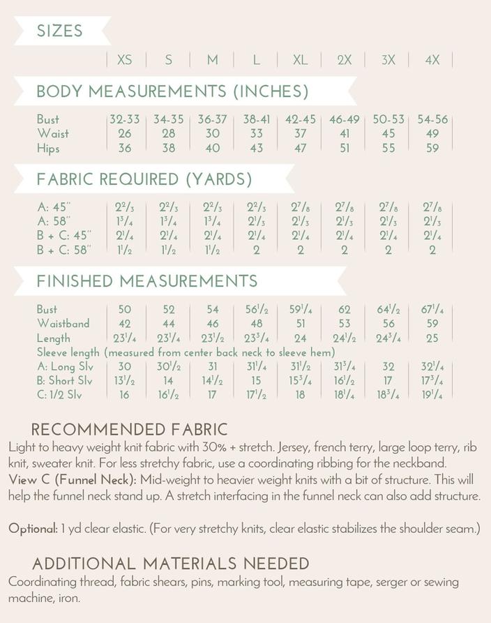 This beginner friendly pattern is a great introduction to working with stretch fabrics. Mix and match the sleeves and neckline for even more variations! The size range includes XS–4X (32″–56″ bust).