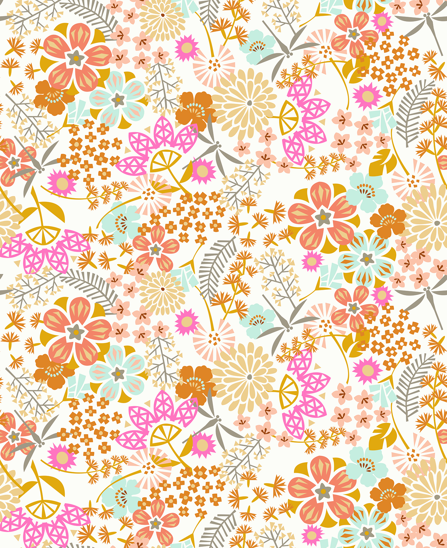 Koi Pond by Rashida Coleman-Hale for Ruby Star Society. Rashida revisited some of the art from early in her design career but recreated it in new colours with her more experienced eye. She wanted the colour palette of this collection to feel like a sunny day at a lake, filled with warm peaches, yellows, toffees and pops of deeper teal.