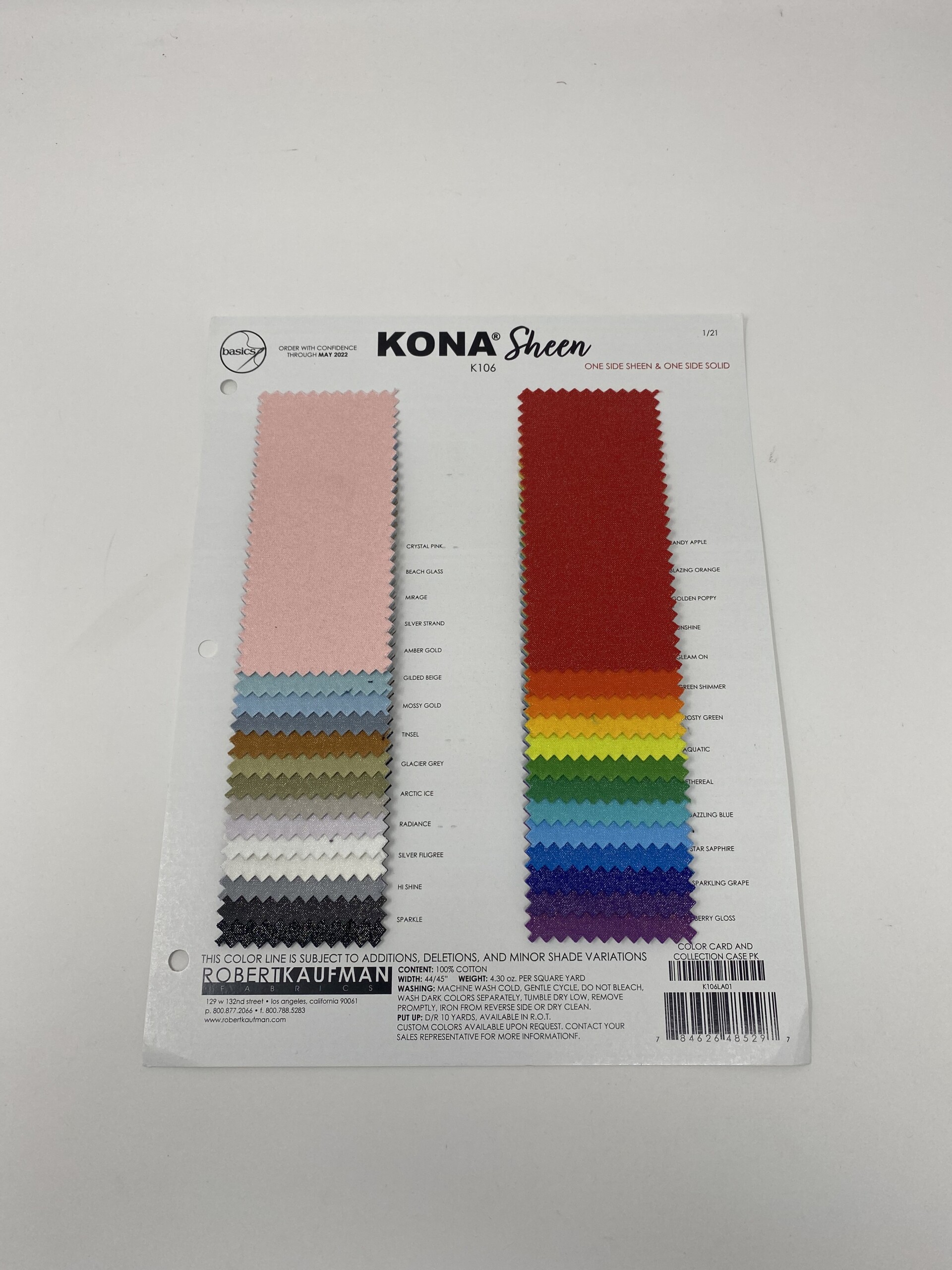 A colour card with swatches of all 27 current Kona Sheen Match to all of your projects with ease!