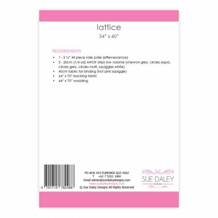 This bright & beautiful quilt designed by Sue Daley measures 54” x 60” and has been designed with the scrappy quilter in mind. The quilt compiles 2 1/2″ strips sewn together and cut and then sewn together by turn every 2nd to achieve this simple but eye catching design. Original fabrics used throughout the quilt are Effervescence by Sue Daley for Riley Blake Designs. Pattern includes Pattern booklet