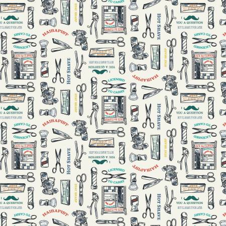 The Licensed to Carry Collection by Dear Stella Fabrics Features Barbers, Mustaches, and other barbering apparel.