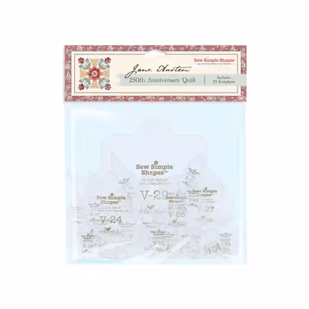 The Jane Austen 250th Anniversary Quilt Sew Simple Shapes™ contain 29 templates designed by Lori Holt of Bee in my Bonnet for the Jane Austen 250th Anniversary Block of the Month Quilt. Made of sturdy plastic, they have center marks and are see-through for fussy cutting. The Block of the Month will be supported through videos on Riley Blake Designs’ YouTube channel.