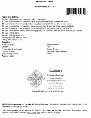 Luminous Cross is an advanced beginner/intermediate quilt pattern. The star and cube blocks are made with oversize pieces and then trimmed to size after sewing. This technique is easier than paper piecing and gives you perfect star points and block sizes. Finished size 30in X 43in.