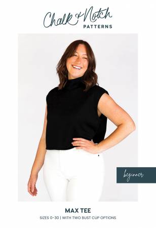 Size 0-30 . The Max Tee is a boxy knit top with a muscle tee shoulder shape and a dropped armhole. There are two lengths: a cropped tee and a hip length with hem facings. The neckline includes three options: a neck facing, a rib neckband, and a mock neckband.