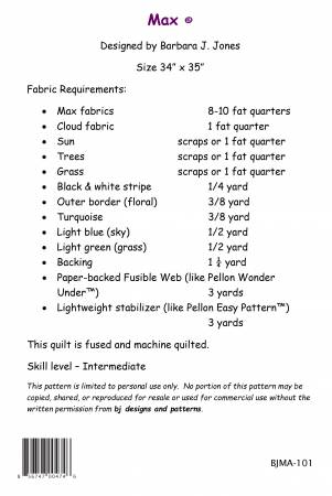 Max is a 34″ x 35″ wall quilt that is fused and machine appliqued. Skill level is Intermediate.
